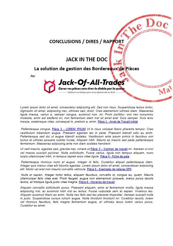 Jack In The Doc c'est la fonction qu'il manquait à Microsoft Word pour gérer borderaux et tamponnage. Rédiger vos conclusions, dires, plaidoiries etc. Jack In The Docs se charge de préparer vos pièces et bordereaux.